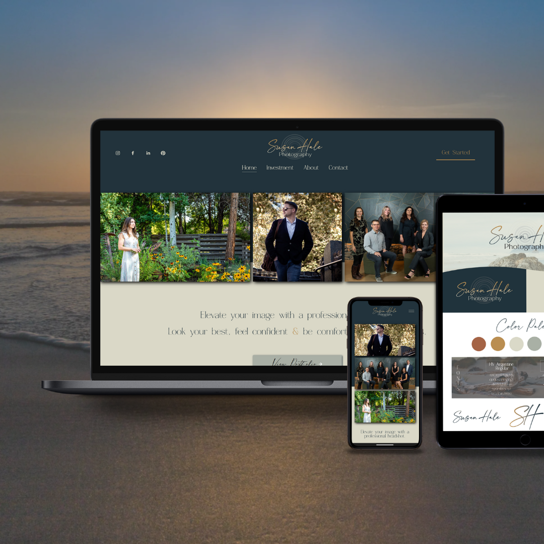 For this branding design & website re-design, we focused on creating an soft & earthy design that blends both natural elements with a clean aesthetic to showcase her photography. This included the use of warmer fall tones complemented with subtle grey and blue accent tones. The final logo captured a design folded closely with nature and the work Susan does with her clients to capture them in a natural light.